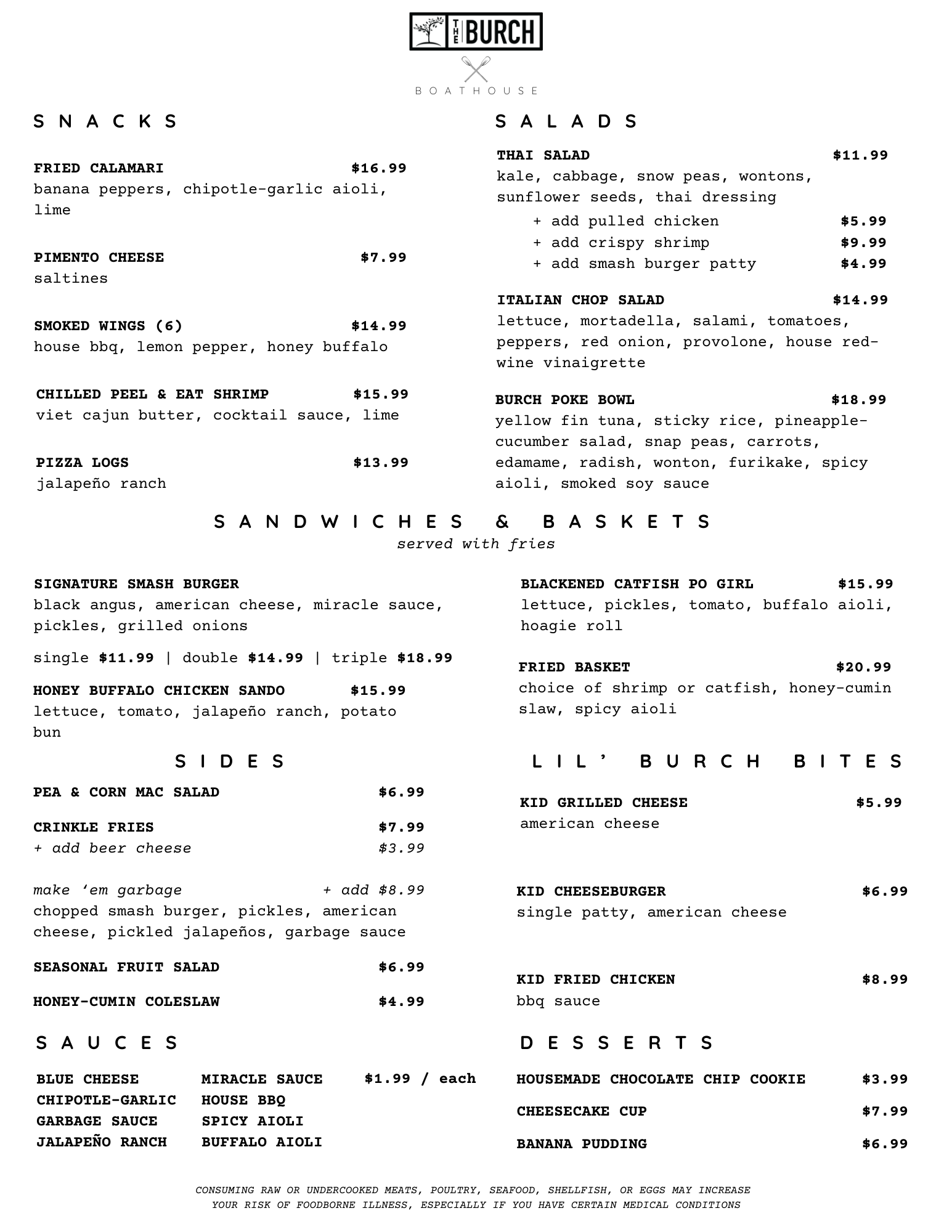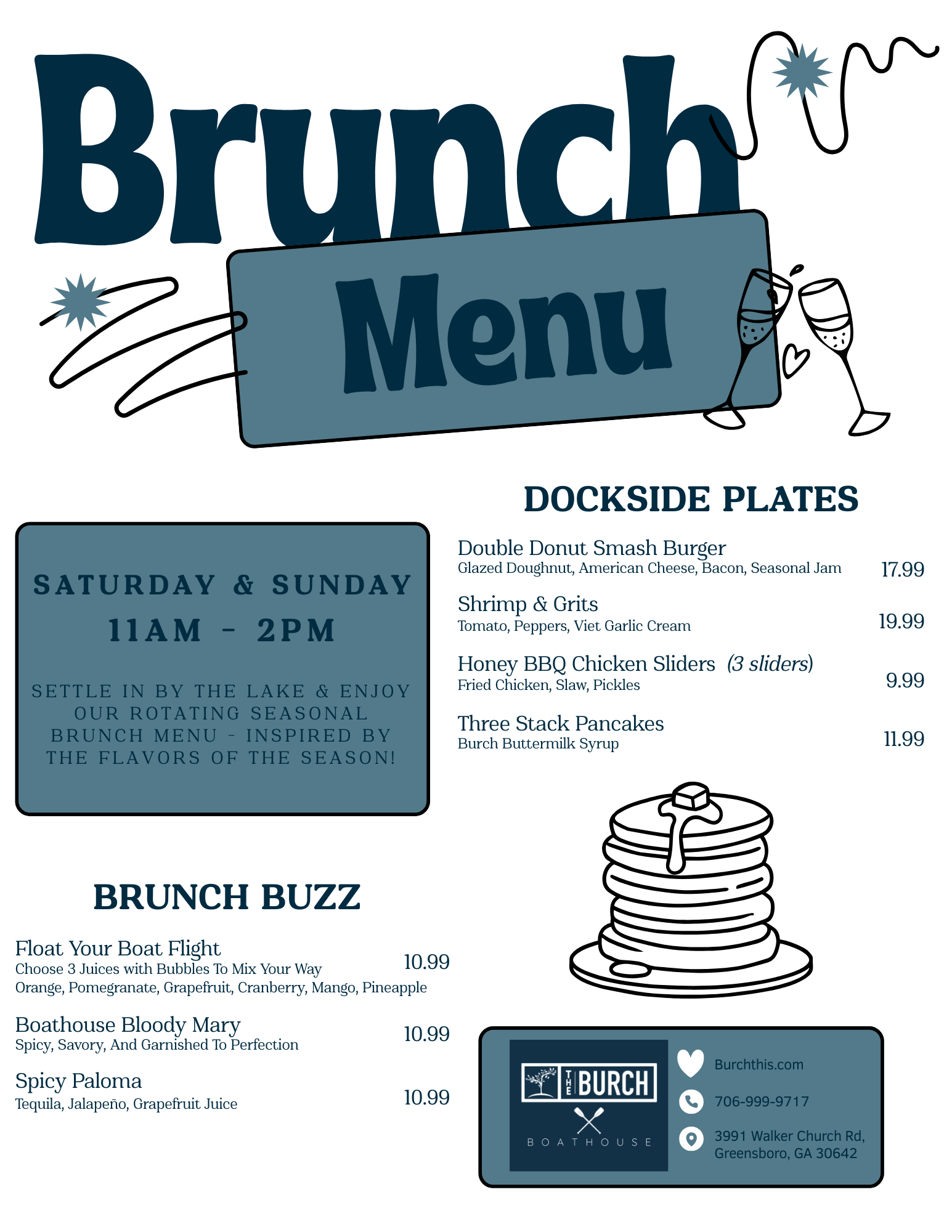 Enjoy a fast, casual dining experience with counter service. When you enter the building, place your order at the counter. You'll receive a buzzer; when it buzzes, return to the counter to pick up your tray of Burch bites. After you're satisfied and ready to head to the lake, please clear your table for the next guest and leave your tray in the designated areas. Both indoor and outdoor seating are available.